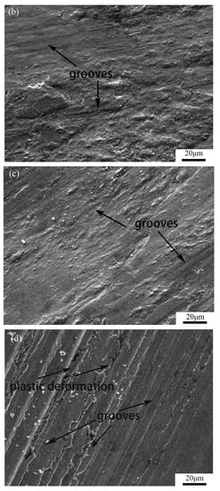 SEM image of the worn surfaces: (a) sample S1, (b) sample S2, (c) sample S3, and (d) sample S4.