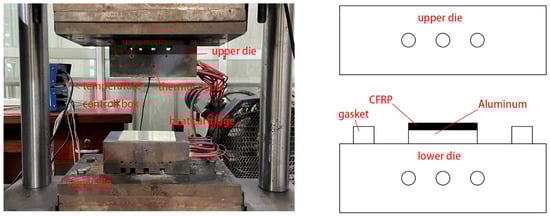 The composite laminates were prepared using the hot press curing integrated method. The hot press curing device is shown in Figure 1, which includes an upper die, a lower die, heat cartridges, a thermocouple, and a temperature control box. The heating box has a power of 1 kW and a temperature control range of 0–999 degrees Celsius. First, the aluminum alloy sheet surface was sanded with 80-grit sandpaper and ultrasonically cleaned to remove debris. Then, 6 layers of CFRP were manually laid on the treated aluminum sheet surface. When the temperature reached the curing temperature (120–140 °C), the composite laminate would be placed between the upper die and the lower die. The laminate was cured under pressure at 18 MPa for 30–60 minutes and then removed from the dies.