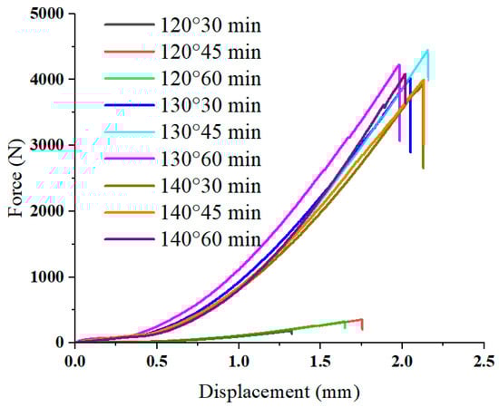 The connection between the CFRP and the aluminum sheet relies on the epoxy resin in the CFRP prepreg. This resin starts to flow under heat, enters the pits in the rough metal surface, and starts to cure when the curing temperature is reached, thus achieving a tight connection between the CFRP and the aluminum sheet. Curing conditions have an important influence on the quality of the CFRP/aluminum alloy interface connection. The best curing conditions were determined using the single-lap shear test, using the interfacial bearing capacity as a measure. The single-lap shear specimen was designed according to ASTM-1002, as shown in Figure 2. The CFRP prepreg was laminated with 6 layers of 0° unidirectional lay-up. After placing the prepreg over the aluminum sheet, they were hot pressed. The specimens were subjected to the single-lap shear test using a WDW-20 electronic universal testing machine (KeXin, Changchun, China) with a loading speed of 2 mm/s. The average of two experimental results was taken for each group. The force–displacement curves of the experimental results are shown in Figure 3. The fracture morphology of the specimen is shown in Figure 4.