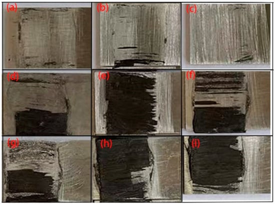 The macroscopic morphology of the interface after the shear test. (a) 120 °C-30 min; (b) 120 °C-45 min; (c) 120 °C-60 min; (d) 130 °C-30 min; (e) 130 °C-45 min; (f) 130 °C-60 min; (g) 140 °C-30 min; (h) 140 °C-45 min; (i) 140 °C-60 min.