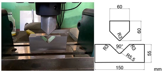 Due to the poor formability of 7075-T6 at room temperature, the aluminum alloy sheet was solution treated at 480 °C for 30 min and rapidly quenched before being laminated with CFRP. The size of the 7075 aluminum alloy sheet was 80 mm × 20 mm, and the thickness was 2 mm and 3 mm. The thickness of the single layer prepreg was 0.15 mm. Six layers of prepreg were laid in 0° unidirectional (0/0/0/0/0/0), 90° unidirectional (90/90/90/90/90/90), 45° orthotropic (45/−45/45/−45/45/−45), 90° orthotropic (0/90/90/90/90/0), and 0° orthotropic (90/0/0/0/0/90). After lay-up, the laminate was hot pressed and cured at 130 °C for 45 min. The bending dies and dimensions are shown in Figure 5.