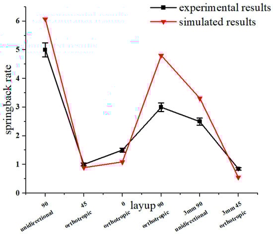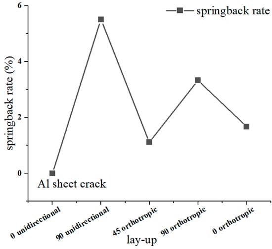 The bending parts with different layer-up sequences are shown in Figure 7. The corresponding springback rates are shown in Figure 8, where the 90° unidirectional springback is 5.5%, the 45° orthotropic spingback is 1.11%, the 90° orthotropic springback is 3.33%, and the 0° orthotropic springback is 1.67%. It is obvious that lay-up direction has an important effect on springback, which is mainly reflected in the resistance to deformation of different lay-ups, i.e., the elastic modulus E.