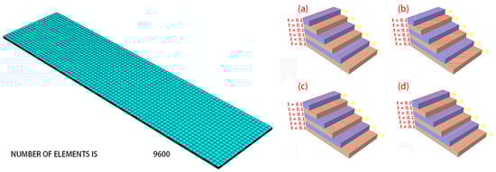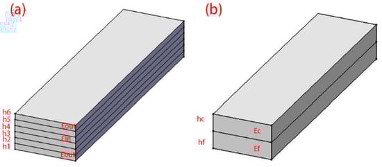 The simplified laminate models are shown in Figure 9. The equivalent elastic moduli of different lay-up laminates can be obtained using the composite theory. The elastic moduli of 0° unidirectional and 90° unidirectional are 130 GPa and 8 GPa, respectively. For the other lay-ups, the core layer thickness/total thickness ratio is introduced.