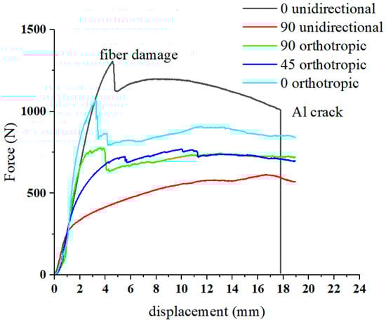 The force–displacement curves with different lay-up laminates are shown in Figure 10. For the laminate with 0° unidirectional lay-up, it was subjected to tensile stress during bending and had a high resistance to deformation. However, the fracture of the fibers and the aluminum alloy sheet occurred during the forming process. The force–displacement curve of the 0° unidirectional lay-up showed two abrupt drops. Because of the aluminum alloy sheet and fiber fracture, the release of residual stress leads to less springback. For the 90° unidirectional lay-up, the fiber bundle flows to both sides along the punch loading direction, and the resistance to deformation is weak. Although fiber fracture also occurs, the residual fiber and aluminum alloy sheet can promote springback. For the 45° orthotropic lay-up, the in-plane shear modulus is much smaller than its tensile modulus along the fiber direction; therefore, during the bending and forming process, the resistance to deformation is weak, causing less springback. Comparing the 90° orthotropic and 0° orthotropic lay-up, it can be seen that the more 0° lay-up, the smaller the springback.