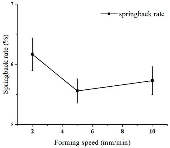 The effect of forming speed on the 90° unidirectional fiber lay-up laminate was studied. The forming speeds were 2 mm/s, 5 mm/s, and 10 mm/s. The springback rates are shown in Figure 11. The springback rates were 6.17% for 2 mm/s, 5.56% for 5 mm/s, and 5.73% for 10 mm/s. Forming speed had little effect on springback. On the one hand, the increase in forming speed enhances the hardening effect of the aluminum alloy, and thus the springback is more obvious. On the other hand, the increase in forming speed causes a thermal effect; part of the energy consumed in plastic deformation is converted into heat, which increases the temperature of the metal and improves the forming properties, which contributes to the reduction in springback.