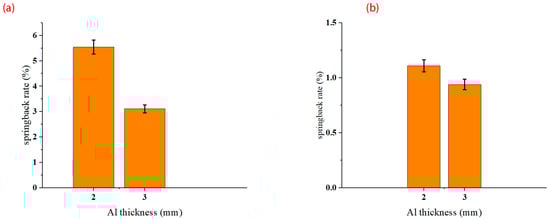 Figure 12 shows the influence of different thicknesses of aluminum alloy sheets on springback. For the 90° unidirectional lay-up, the springback rate is 5.55% for the 2 mm aluminum alloy sheet and 3.11% for the 3 mm aluminum alloy sheet (Figure 12a). For the 45° orthotropic lay-up, it also shows that the springback rate will decrease with the increase in aluminum alloy sheet thickness. The effect of different metal thicknesses on laminate bending is mainly controlled by the relative bending radius. When r/t is small, the elastic deformation accounts for a low proportion, and the springback reduces.