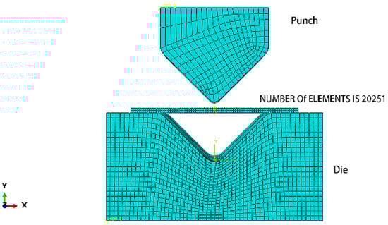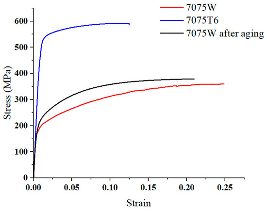 Simulation analysis of bending and springback was performed using Abaqus/Explicit. This simulation method uses the central difference method to complete the simulation with the help of multiple time increments and is suitable for analysis with large deformations. The 7075-T6 aluminum alloy sheet was subjected to hot pressing treatment after solution, which is equivalent to aging treatment. The stress–strain curves with different heat treatments are shown in Figure 13. The solution treatment improved the plasticity of the 7075 aluminum alloy and reduced the strength, but the W-state aluminum alloy was in an unstable state. After hot pressing at 130 °C for 45 minutes, the properties of the material tended to be stable, and the plasticity was greatly improved compared to that of the T6 state, which can be used for bending forming. The mechanical properties of the 7075 aluminum alloy sheet after hot pressing at 130 °C for 45 minutes are shown in Table 5. The mesh model is shown in Figure 14. The aluminum alloy sheet is C3D8R with a mesh size of 0.2 mm, and CFRP is C3D8R with a mesh size of 0.1 mm. Theoretically, the smaller the meshing size, the more realistic the simulation results; however, increasing the number of meshes can significantly increase the computing time and may cause the software to crash. For this consideration, meshing was performed. The punch and die are non-deformed rigid cells, and the mesh shape is quadrilateral with a neutral axis algorithm. The lay-up of CFRP modeling is shown in Figure 15.