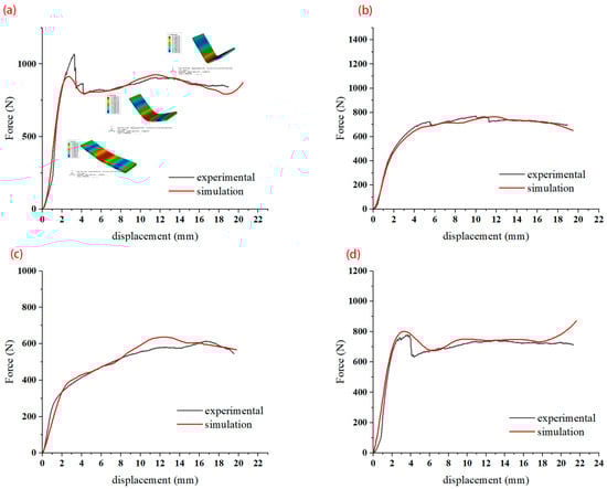 Simulation and experimental comparison of force–displacement. (a) 0 orthotropic; (b) 45 orthotropic; (c) 90 unidirectional; (d) 90 orthotropic.