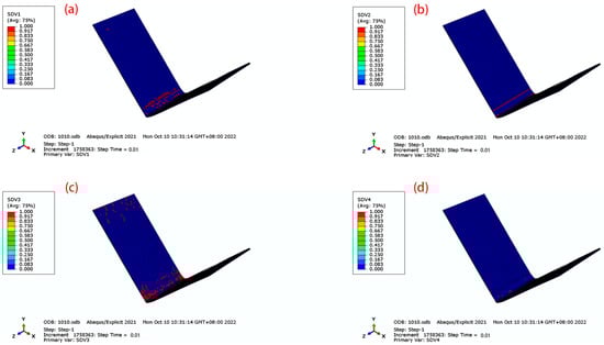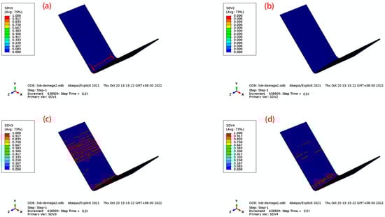 Damage of CFRP for 45 orthotropic. (a) SDV1; (b) SDV2; (c) SDV3; (d) SDV4.