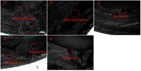 Microscopic observation of the molding area is shown in Figure 20. Unidirectional fibers can lead to severe damage behavior, such as fiber fracture, for the 0° unidirectional lay-up and matrix fracture for the 90° unidirectional lay-up. For the laminates with 45° orthotropic lay-up, partial fiber breakage of the outer layer is visible, which is relatively less damaged. For the laminate with the 90° orthotropic lay-up, the same matrix fracture is seen in the 90° fibers of the core layer. In addition, fiber delamination is seen at the junctions of the 0° and 90° fibers. The appropriate lay-up method can reduce the occurrence of damage, which verifies the accuracy of damage prediction using the finite element method.