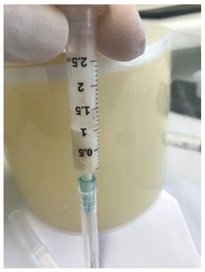 The syringe containing 1 cc of granules and demineralized water inserted drop by drop.
