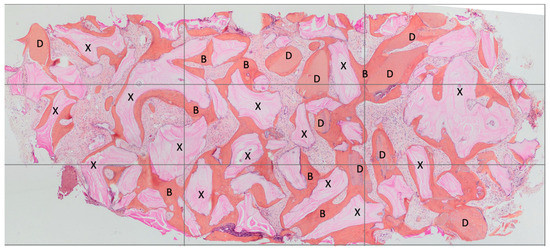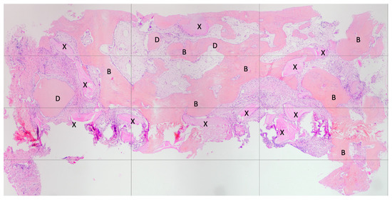 Histology after 8 months from the same patient. In this histological image, the remaining xenograft material granules can be observed—marked with X. The residual dentin granules are marked with D. The bone tissue is highlighted with B. It is evident, both visually and as supported by histomorphometry, that the xenograft material granules were less resorbed compared to the dentin granules.