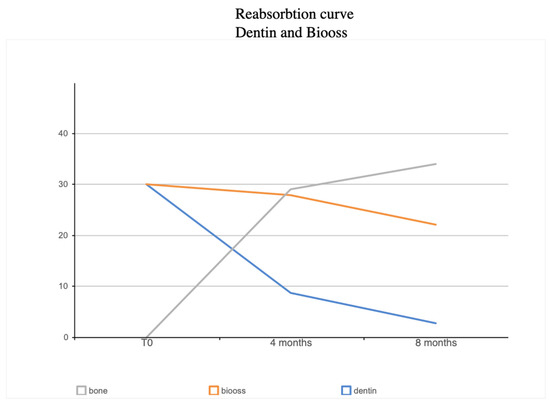 At four months, the dentin (blue line) showed partial resorption, measuring approximately 8%. In contrast, the Bio-Oss material (red line) exhibited less pronounced resorption, with approximately 28% remaining. The gray line representing the bone tissue showed an increase of 29%.