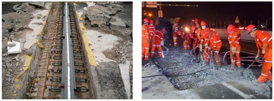 As the service life of highway bridges increases and traffic flows become more dramatic, bridge deck pavement inevitably suffers from varying degrees of damage. A common typical disease is the breakage of expansion joints (Figure 1), which regulate the connection and displacement of the upper bridge deck structure to ensure smooth vehicle movement. It is noted that the infilled concrete is subjected to external factors such as structural shrinkage, impact fatigue, natural disasters, and vehicle overloading, which can lead to cracking, spalling of the concrete cover, and even outright failure [,]. High-strength steel-fiber-reinforced concrete (HSFRC) has become increasingly popular as a cast-in-place jointing material in precast assembled concrete bridges and buildings due to its excellent tensile strength and resistance to crack development [,]. However, the Highway Agency often requires repairs to be completed within six hours during the night so that lanes can be reopened the next morning to avoid disruption to road users []. However, the replacement of the existing expansion joint concrete requires a number of operations, such as cutting and chiseling of the old concrete and casting of the new concrete, which often takes a long time and can cause extensive traffic congestion. Moreover, the poor stability of the construction quality and the extremely high rework rate reduce the efficiency of the highway. The search for a rapid-hardening concrete with high early strength that can be used to repair bridge decks quickly and with minimum disruption to traffic has therefore become a high priority. For this reason, a new rapid-hardening HSFRC has been proposed, which is produced using sulphoaluminate cement (SC) instead of ordinary Portland cement [,]. This type of concrete is feasible in the actual construction site using rapid-paced construction and is suitable for the rapid repair of various bridge pavements. It can effectively solve the current problems of prolonged traffic closure, low traffic throughput, and economic loss due to the insufficient life of repair materials during bridge deck pavement repair.