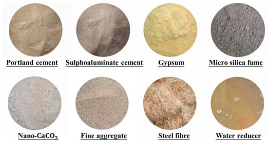 The material mass proportion for both types of HSFRC was cementitious material: fine aggregate: steel fiber: water: water reducer = 42:40:6:10:2. Note that the two types of concrete differed only in the mass proportion of cementitious material, with the conventional type using ordinary Portland cement: microsilica fume: Nano-CaCO3 = 77:20:3, and the rapid-hardening type using sulphoaluminate concrete: ordinary Portland cement: gypsum: microsilica fume: Nano-CaCO3 = 45:16:16:20:3. A close-up view of the raw materials is shown in Figure 3.