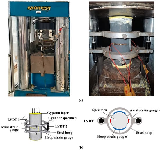 All quasi-static compression tests were carried out in accordance with the American Specification ASTM C469/C469M-14 []. The test setup and instrumentation are shown in Figure 5. Specifically, a displacement-controlled loading mode was used with a constant rate of 0.18 mm/min, corresponding to 10−5 s−1. All specimens were loaded in two steps: (1) Each specimen was preloaded to 10% of the expected peak load to verify loading axis alignment and proper instrument operation. (2) After preloading, all specimens were formally loaded until the load dropped to 40% of the measured peak load. In addition, the same linear displacement transducers (LVDTs) and strain gauge arrangement were used for all specimens: (1) two LVDTs installed symmetrically to cover the middle two-fifths of the column height to measure axial shortenings; (2) two strain gauges installed symmetrically in the axial direction with a gauge length of 50 mm to measure axial deformations of the midheight section in the specimen; and (3) two strain gauges installed symmetrically in the hoop direction with a gauge length of 50 mm to measure hoop deformations of the midheight section in the specimen. All test data were automatically collected every second using a data acquisition system.
