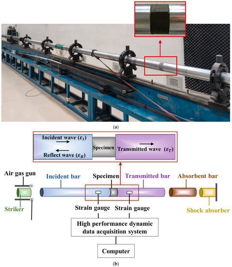 Setup and instruments of dynamic compression tests. (a) Test setup. (b) Layout of strain gauges.