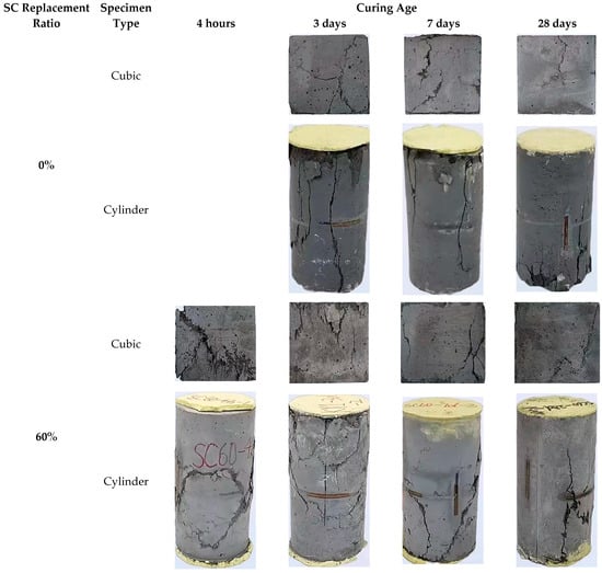 Figure 7 shows typical failure modes of cubic and cylindrical specimens tested under quasi-static compression loading. All of the quasi-static compressive specimens failed by early crack initiation followed by rapid crack propagation and even concrete crushing. A conical final failure mode was observed in the midheight region of all specimens. It is noteworthy that as the load approached its peak, all specimens showed surface cracking of the concrete protective layer, followed by the formation of major vertical cracks and the development of multiple diagonal cracks along the vertical cracks. Furthermore, both types of HSFRC specimens showed a gradual decrease in the crack numbers as the concrete curing age increased. Furthermore, the rapid-hardening HSFRC specimens all had higher crack numbers than their conventional counterparts at the same curing ages. Note that with earlier curing ages or higher SC replacement ratios, the cubic and cylindrical specimens exhibited more significant diagonal splitting cracks. This relationship twisted with the increasing curing age or decreasing SC replacement ratio, i.e., the specimens developed a dominant failure with the vertical cracking. This finding may be related to the strength development level of the base material, with the diagonal-crack-dominated failure occurring when their diagonal shear capacity is lower than the corresponding vertical splitting capacity and, conversely, with vertical-crack-dominated failure.