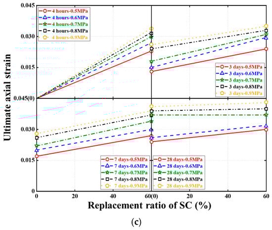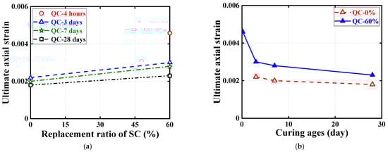 Effect of SC replacement ratios on ultimate conditions of quasi-static compression tests. (a) Ultimate axial stress. (b) Ultimate axial strain.