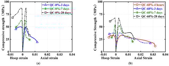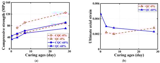 Effect of concrete curing ages on ultimate conditions of quasi-static compression tests. (a) Ultimate axial stress. (b) Ultimate axial strain.