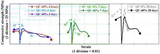 Figure 11 illustrate the effect of concrete curing ages on the quasi-static compressive stress–strain response of cylinders with conventional and rapid-hardening HSFRC, respectively. The effect of concrete curing ages is similar to previous studies []: as the concrete curing age increased, the compressive strength of the cylindrical specimens under quasi-static loading increased; by contrast, the corresponding ultimate strain decreased. Furthermore, Figure 13 clearly shows that the elastic modulus and Poisson’s ratio of both types of HSFRC cylindrical specimens generally increased with increasing curing age. Interestingly, the effect of concrete curing ages on the quasi-static compressive elastic modulus and Poisson’s ratio of HSFRC cylindrical specimens was significant until the curing age was less than 7 days; however, the effect of curing age became less pronounced when the curing age was greater than 7 days. This phenomenon demonstrates that an early curing age is crucial for the development of the quasi-static compressive properties of HSFRC.