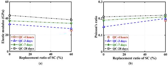 Effect of SC replacement ratios on ultimate conditions of quasi-static compression tests. (a) Elastic modulus. (b) Poisson’s ratio.