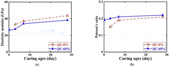 Effect of concrete curing ages on ultimate conditions of quasi-static compression tests. (a) Elastic modulus. (b) Poisson’s ratio.