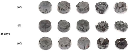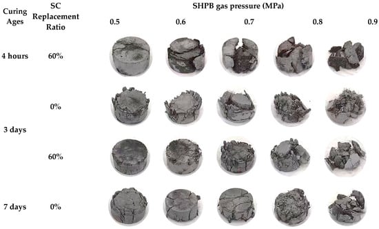 Figure 14 shows the typical failure modes of the FBD specimens tested under dynamic compression loading. All of the dynamic compressive specimens experienced either macroscopic cracking or crushing damage. Specifically, the concrete cracking first occurred on the sides of the FBD specimens and subsequently developed in both two-specimen planes along the height direction. Such crack propagations triggered both the spalling of the concrete protective layer and the successive appearance of crushing in the specimen core. Additionally, it was noteworthy that the specimens with both types of HSFRC exhibited more significant cracking and even crushing as the strain rate (or SHPB gas pressure) increased or the concrete curing age decreased, i.e., the integrity of the specimens after failure became increasingly degraded. Specifically, with the increasing strain rate (or SHPB gas pressure) or the decreasing concrete curing age, the specimens eventually failed in more fragments with smaller volumes. It is noted that there may be a threshold between the strain rate (or SHPB gas pressure) and specimen cracking (or crushing): when the strain rate (or SHPB gas pressure) is greater than a certain threshold, HSFRC specimens will crack or crush. Specifically, when the SHPB gas pressure is greater than 0.5 MPa (corresponding to a strain rate of 43 to 90 s−1), all HSFRC specimens will experience macroscopic cracking; when the SHPB gas pressure is greater than 0.8 MPa (corresponding to a strain rate of 81 to 135 s−1), all HSFRC specimens will experience almost complete separation of mortar, aggregate, and steel fibers. Further observations of the specimen’s failure modes were made after testing. Note that a large number of steel fibers were observed to be pulled out as a whole but not broken. This phenomenon indicates that the anchoring capacity of the steel fibers used in this study was poor, i.e., better mechanical properties of HSFRC could be achieved if steel fibers with stronger anchoring capacity were used. In addition, FBD specimens with rapid-hardening HSFRC had significantly fewer cracks than their conventional counterparts, maintaining a higher degree of postfailure integrity. This was more pronounced at the early curing age, suggesting that the introduction of SC favored the dynamic performance of the HSFRC, which may be attributed to the higher early strength.