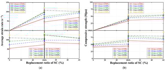 Effect of SC replacement ratios on ultimate conditions of dynamic compression tests. (a) Average strain rate. (b) Compressive strength. (c) Ultimate axial strain.