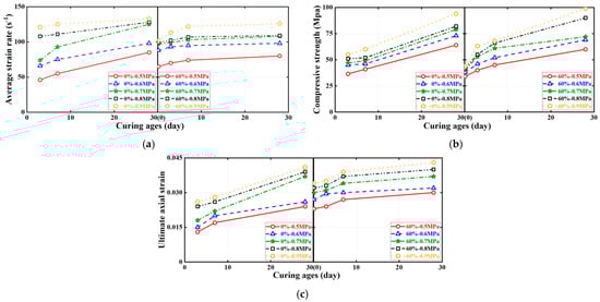 Effect of concrete curing ages on ultimate conditions of dynamic compression tests. (a) Average strain rate. (b) Compressive strength. (c) Ultimate axial strain.
