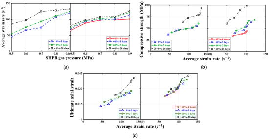 Effect of strain rates on ultimate conditions of dynamic compression tests. (a) Average strain rate. (b) Compressive strength. (c) Ultimate axial strain.