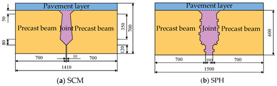 The detailed dimensions of the specimens with conventional reinforcement (SCM) and pinned reinforcement (SPH) [32] were as shown in Figure 1. The specimens consist of three parts: post-cast joint, pavement layer, and precast beam. For SPH, wooden blocks were reserved at the interface location to form a recess of size 30 × 20 mm before placing the concrete in the beam section. The hinge joint concrete interface was sprayed with a high-pressure water gun with an average spray depth controlled at 6 mm.