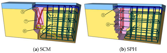 The concrete with a design strength of 40 MPa was used for the beam concrete, and the concrete with a design strength of 60 MPa was used for the joint concrete. Hot-rolled ribbed bars with a yield strength of 400 MPa were used for specimens. SPH was also enhanced with hinge joint reinforcement using three layers of U-shaped reinforcement in the form of pin joint reinforcement. The reinforcement details of specimens are shown in Figure 2 [32]. The numbers ①, ②, ③, and ④ represented beam segment reinforcements, and their diameter was 8 mm. The number ⑤ represented pavement layer reinforcements, and its diameter was 10 mm. Moreover, the numbers ⑥, ⑦, and ⑧ represented U-bar, conventional reinforcements, and pinned reinforcements; their diameter was 12 mm.