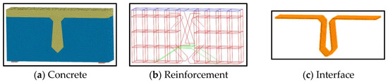 The finite element model, as shown in Figure 4, was established according to the design scheme of Section 2.1, and it included concrete, reinforcement, and interface. Considering the nonlinear finite element analysis, the meshing of the three-dimensional model was studied. The grid size would affect the accuracy of finite element analysis. The smaller the grid, the higher accuracy of the calculation results, but the speed of the analysis would also be greatly reduced. Under the premise of ensuring the accuracy of calculation, the grid size was determined to be 20 mm. Meanwhile, there were many irregular shapes in the joint. The tetrahedral grid shape can obtain high-quality solid elements at the corner of the joint, which is more conducive to the analysis and calculation.