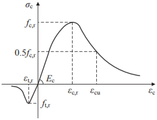 In MIDAS FEA NX, the main constitutive models for simulating the mechanical behavior of concrete were the concrete smeared crack mode and the concrete plastic damage model. The concrete plastic damage model (CDP) could reasonably simulate the cracking and damage of concrete materials. This study used this model to simulate concrete plastic material properties. The specific parameter settings are shown in Table 1. The uniaxial stress-strain curve of concrete is shown in Figure 5.