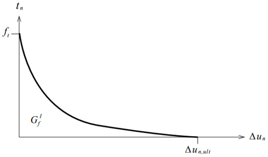 According to the static test, the surface between the joint and the beam cracked, so the discrete cracked constitutive model was used to simulate the bond surface. The essence of this model was the combination of discrete elements and interface elements, and the relative displacement relationship between elements simulated the structural cracking. When the normal stress of the interface element reached the tensile strength, the relative displacement occurred between the main elements, equivalent to the cracking of the concrete bonding surface. In this paper, the nonlinear tensile softening model was selected as the functional relationship of the intrinsic model of the interface element (Figure 7), and the fracture energy in the model parameters was beneficial to the convergence of the calculation results.