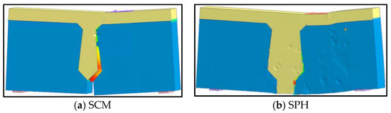 Comparing the finite element analysis results of SCM and SPH with the experimental results (Table 3), it was found that the average value, standard deviation and coefficient of variation of crack penetration load were 0.91, 0.02 and 0.03, respectively, so the consistency between the experimental and analysis results of crack penetration load was high, with a maximum error of 12.20%. Moreover, the damage mode of the finite element model was shown in Figure 8, which was consistent with the location of specimen cracking in the statical test at the surface between the loading segment and joint. For the cracking load, SCM and SPH’s finite element analysis results were less than the experimental results. Because the transverse displacement of the interface element was the criterion in judging the crack load of the finite element model, but in the statical test, it could be judged by observing the cracks on the joint’s surface. Furthermore, the interface cracking inside the joint was earlier than the surface, and the cracking load of the finite element model was smaller than that obtained from the test.