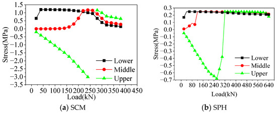Figure 11 shows the stress distribution of the interface element in the finite element analysis. Before the crack penetrating load, the interface element’s stress states at different positions differed. The lower and middle interface elements bore tensile stresses, while the upper interface elements bore compressive stresses. The stresses in the lower and middle interface elements continuously increased with the load increase. The interface element cracked when the stress was equal to the tensile strength in the material parameters. In addition, the compressive stress on the upper interface element increased at first, and when it reached the crack penetration load, the stress of the interface element suddenly changed to tensile stress and achieved the tensile strength value. The upper interface cracked at this time. From the perspective of the interface stress, it could be proved that the crack developed upward with the increasing load, which was consistent with the experimentally observed damage process. Therefore, the finite element analysis of SCM and SPH had a high degree of agreement with the experiment.