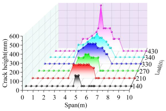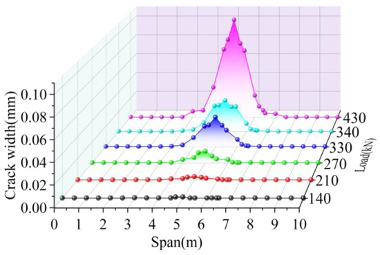 The cracking height of the joint interface elements is shown in Figure 17. The cracking width of the interface elements is shown in Figure 18. Under the load of 140 kN, the joint interface cracked at the load position; the crack height and width were 120 mm and 0.001 mm, respectively. The crack length of the interface along the longitudinal direction was 0.3 m. With the load increase, the cracks developed along the joint’s height direction and the bridge’s longitudinal direction. When the load reached 210 kN, the cracking height of the interface in the mid-span increased by 33.33%, its cracking width increased by 200%, and the cracking length in the longitudinal direction increased by 566.67%. When the load increased to 270 kN, the cracking height and width of the mid-span interface increased by 25.00% and 266.67%, respectively. When the load was increased to 330 kN, the crack height, crack width, and longitudinal crack length of the mid-span interface increased by 25.00%, 163.64%, and 50%, respectively; when the load increased to 340 kN, the crack of the interface along the longitudinal direction developed to 3/10 of the span, and the length increased by 16.67%. The crack height at the mid-span interface increased by 20.00%, and the crack width increased by 6.90. Under the ultimate load of 430 kN, the crack developed to the lower edge of the pavement layer, the maximum crack width in the mid-span was 0.102 mm, and the crack length in the longitudinal direction was 4 m. Comparing the data under the previous level of load, the crack height, crack length, and crack width increased 100.00%, 14.29%, and 229.03%, respectively.