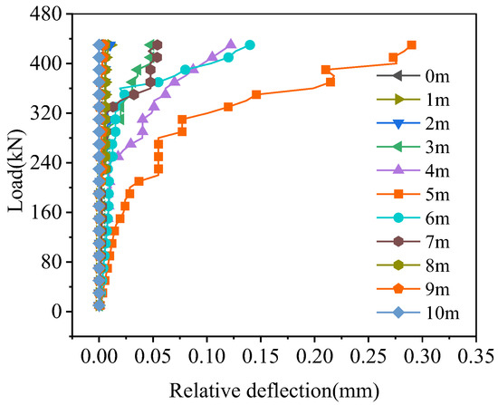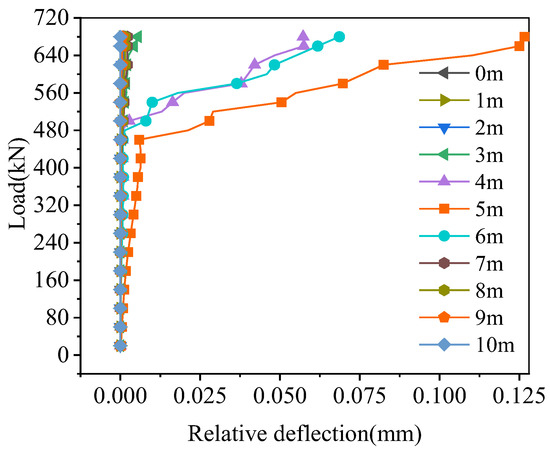 The relative deflection of the hollow-core slab on both sides of the joint is shown in Figure 19. Except for the 0.3–0.7 times the span, the relative deflection at other locations was 0 because the damage of the joint interface at these locations was small; the interface crack width and crack height at these locations in Figure 17 and Figure 18 were equally small, and the joint interface was not cracked under the ultimate load. When the load reached 430 kN, compared to the relative deflections in the mid-span, the relative deflections at 0.3, 0.4, 0.6, and 0.7 times the span were reduced by 83.45%, 61.38%, 51.72%, and 81.38%, respectively. Therefore, the damage to the joint interface at the location where load acts in mid-span was the greatest, which resulted in the biggest relative deflection of the hollow-core slab, and the relative deflection decreased symmetrically with the increase of the distance from the load point.