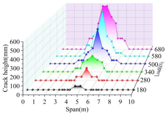 The cracking height of the joint interface elements is shown in Figure 21. The cracking width of the interface elements is shown in Figure 22. When the load was 180 kN, the hinge joint interface at the load position cracked with a crack height was 45 mm, the crack width was 0.001 mm, and the crack length was 0.2 m along the longitudinal direction. As the load increased, the crack height and width increased, and the interface at the remaining positions cracked, and when the load grew to 280 kN, the crack height of the joint interface at the mid-span load position increased by 233.33%, and the crack width increased by 200.00%. Along the longitudinal direction, cracks developed to 0.4 and 0.6 times the span, and the crack length increased by nine times. When the load increased to 380 kN, the crack height increased by 33.33%, the crack width increased by 133.33%, and the crack length increased by 16.67%. When the load increased to 500 kN, the cracking height of the joint at the mid-span increased by 125.00%, the crack width increased by six times, and the cracking length increased by 41.67%. When the load reached 580 kN, the crack height of the joint interface in the span was 600 mm, which increased by 33.33% compared with the crack height of the upper load, and the maximum crack width in the span increased by 157.17%. At this time, the crack at the joint interface developed to 0.3 and 0.7 times the span, and the longitudinal crack length reached 4 m. Under the ultimate load of 680 kN, the cracks developed in the lower edge of the pavement layer at the position 0.45 times the span, and the maximum crack width in the span increased by 23.02%. Therefore, under the load, the bridge was cracked at the load position. As the load increased, the cracks developed upward along the height and eventually reached the lower edge of the pavement layer. Cracks developed symmetrically toward the ends of the bridge along the longitudinal direction, eventually reaching 0.3 and 0.7 times the span, with a longitudinal crack length of 4 m. The crack width of the joint interface was greatest at the load position and gradually decreased symmetrically by increasing the distance from the load position.
