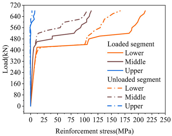 The stress trend of the tensile reinforcement in the joint is shown in Figure 24. Moreover, there were three layers of pinned reinforcement in the joint, and the stress of tensile reinforcement at the interface position was extracted. The stress of the lower reinforcement was the largest, and the stress decreased from bottom to top. Under the ultimate load of 680 kN, the stress of the lower reinforcement at the loading segment was 212.73 MPa. Compared with the lower reinforcement, the stress of the middle and upper reinforcement decreased by 47.11% and 96.32%, respectively. Furthermore, the stress of the lower reinforcement at the unloaded side was 166.23 MPa. Compared with it, the stress of the middle and upper reinforcement was reduced by 37.08% and 98.50%, respectively. The stress of the loaded segment was always greater than the unloaded segment because the load acted on the loaded segment, and the joint transferred the load from the loaded segment to the unloaded segment. The lower and middle reinforcement stress was tensile, which showed a uniform-rapid-slow change trend with the load increase. The upper reinforcement stress was compressive stress, and its stress was 0 MPa before the interface was cracked, and the reinforcement stress started to increase when the upper interface was cracked. Therefore, the reinforcement and the interface shared the role of load transfer, and after the interface cracking, the joint reinforcement at this location played the leading role.