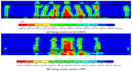 The bearing capacity of the conventional reinforcement hollow-core slab bridge (BCM) and pinned reinforcement hollow-core slab bridge (BPH) are shown in Table 5. The joint’s bearing capacity and damage mode were analyzed as an example. Figure 25 shows the damage to the joint concrete.