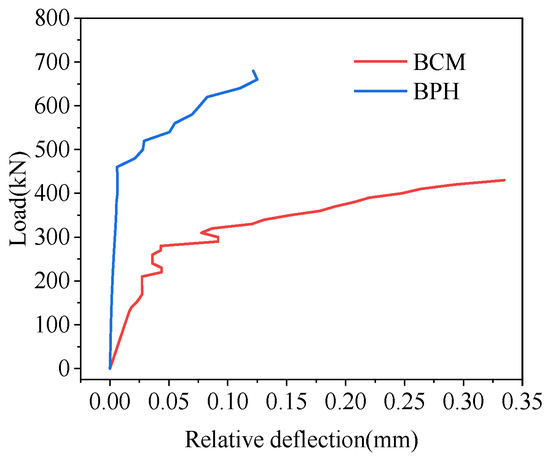 The relative deflection of the hollow-core slab on both sides of the joint at the load position in mid-span is shown in Figure 27, which would increase with the load increase. Under the load of 420 kN, the relative deflection of the joint of BCM and BPH was 0.292 mm and 0.006 mm, respectively, and the relative deflection of BPH was 97.95% less than that of BCM. The results showed that using pinned reinforcement and grooves could enhance the bridge’s integrity and improve the joint’s load transfer performance. The grooves between the joint and the hollow-core slab enhanced the bonding effect, so this type of joint had good load transmission performance.