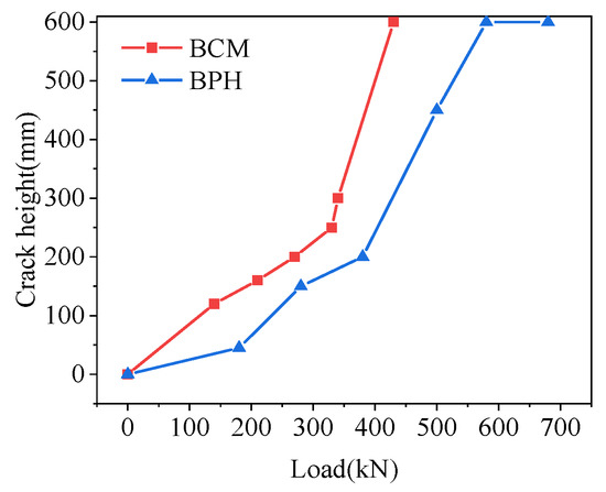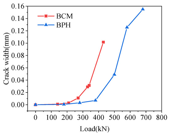 The crack height and width of the joint interface for hollow-core slab bridges with different joint forms under load are shown in Figure 28. Generally speaking, the crack height at the joint interface increases with the increase in load. Because different joint forms had different grids, the crack height growth trend was inconsistent. When the crack height reached 600 mm at the lower edge of the pavement layer, the corresponding loads of BCM and BPH were 430 kN and 580 kN, respectively, and the load of BPH was increased by 34.88% compared with BCM. Therefore, the hollow-core slab bridge with pinned reinforcements and grooves had better mechanical properties of joints and could slow down the development of cracks along the height direction.