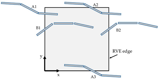 The RVE generation is based on the ubiquitous Random Sequential Adsorption Algorithm, RSAA [40,41]. As the name suggests, it works by generating reinforcements with a random orientation and position within the RVE domain. The generation of reinforcements is sequential, which means that only one reinforcement is adsorbed into the RVE before a new one is generated. The reinforcement is checked for admissibility, verifying that no intersections with other reinforcements already adsorbed in the RVE are detected. If this condition stands, the reinforcement is adsorbed, and the RVE volume fraction increases accordingly. If intersections are detected, the reinforcement is discarded. This process is iterated until the target volume fraction is reached.