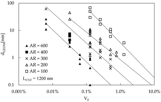 Several RVEs were generated at different volume fractions and aspect ratios considering straight CNTs, following the procedure described in Section 3. The predicted values for dGEOM of 22 simulations of RVEs are reported in Figure 2, where for each RVE, three points are plotted, representing dGEOM calculated in the three periodic directions. The dotted lines represent power law regression curves for the average dGEOM value of each RVE. In these simulations, the CNT length, LCNT, was 1200 nm, while the RVE edge was equal to 2400 nm. Such values were chosen following a convergence analysis, which proved to be coherent with that reported in [46].