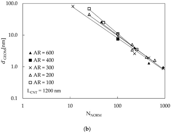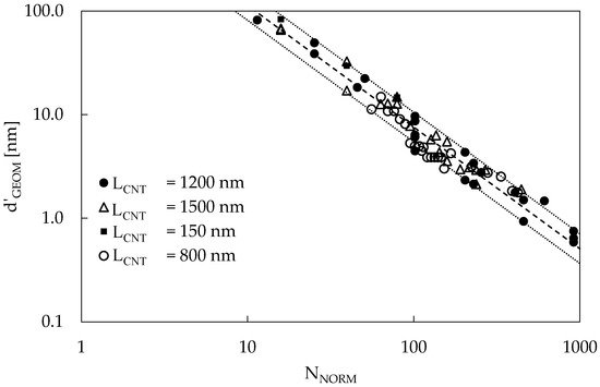 To assess the validity of this band, even accounting for an LCNT change, new RVEs were generated considering reasonable values for CNT length (such as 150, 800, 1200, and 1500 nm). The results are reported in Figure 4 in terms of d’GEOM as a function of NNORM. The d’GEOM for each different value of LCNT was conveniently scaled up (or down) with a multiplying factor equal to LCNT/1200 nm to show that, using such scaling, the new data points belong to the same band. Under this condition, the existence of the proposed band appears to be independent of LCNT; thus, it is possible to use it to infer the interparticle distance for every combination of LCNT, AR, and VF.