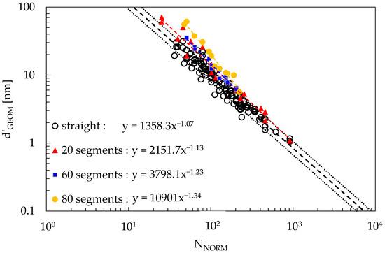 Plots for d’GEOM as a function of NNORM for different values of CNT curvature, as reported in the legend. The case of straight segments aggregates all data reported in the previous figures, while for the case of curved CNTs, three RVEs were generated for each curvature, with AR = 100, 200, and 600, and EdgeRVE = 2400 nm. The dashed line represents the power law best fit of the average values, while the dotted lines represent 10% and 90% probability.