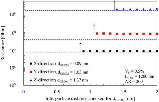To support the validity of the assumption, Figure 6 shows a comparison of the predicted values for the RVE resistance as obtained by the two approaches. The figure reports the case of an RVE with VF = 0.5%, LCNT = 1200 nm, AR = 200, and energy barrier 1 eV. Three datasets are reported in the image, considering the same RVE simulated in the three periodic directions, alongside the estimation of the electrical resistance of the sole junction at dGEOM according to Equation (1). At an interparticle distance greater or equal to dGEOM, the electrical resistance assumes a finite value since the BFS algorithm finds a path connecting the source and sink faces. Such resistance is kept practically constant even if additional contacts may be added to the network at distances greater than dGEOM. Adding those contacts means, from an electrical perspective, that new resistors are being placed in a parallel configuration with respect to the existing ones, but since they have a significantly higher electrical resistance, they would only marginally affect the overall resistance of the RVE.
